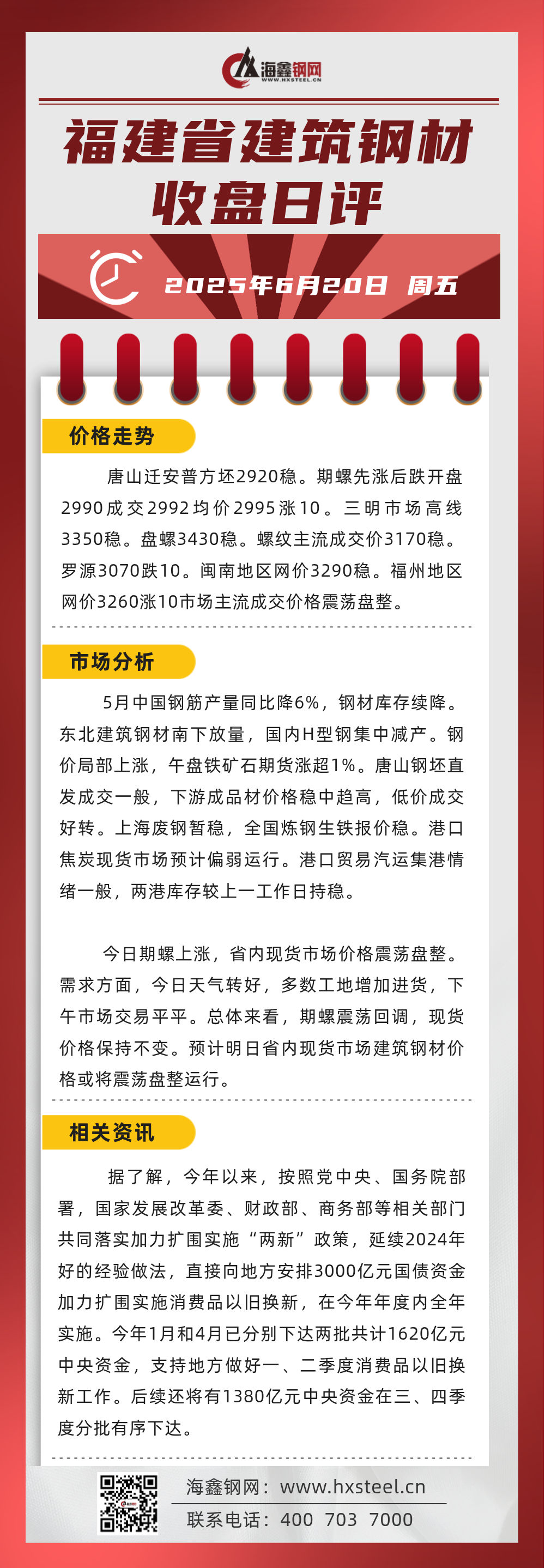 6月20日福建省內建筑鋼材收盤日評