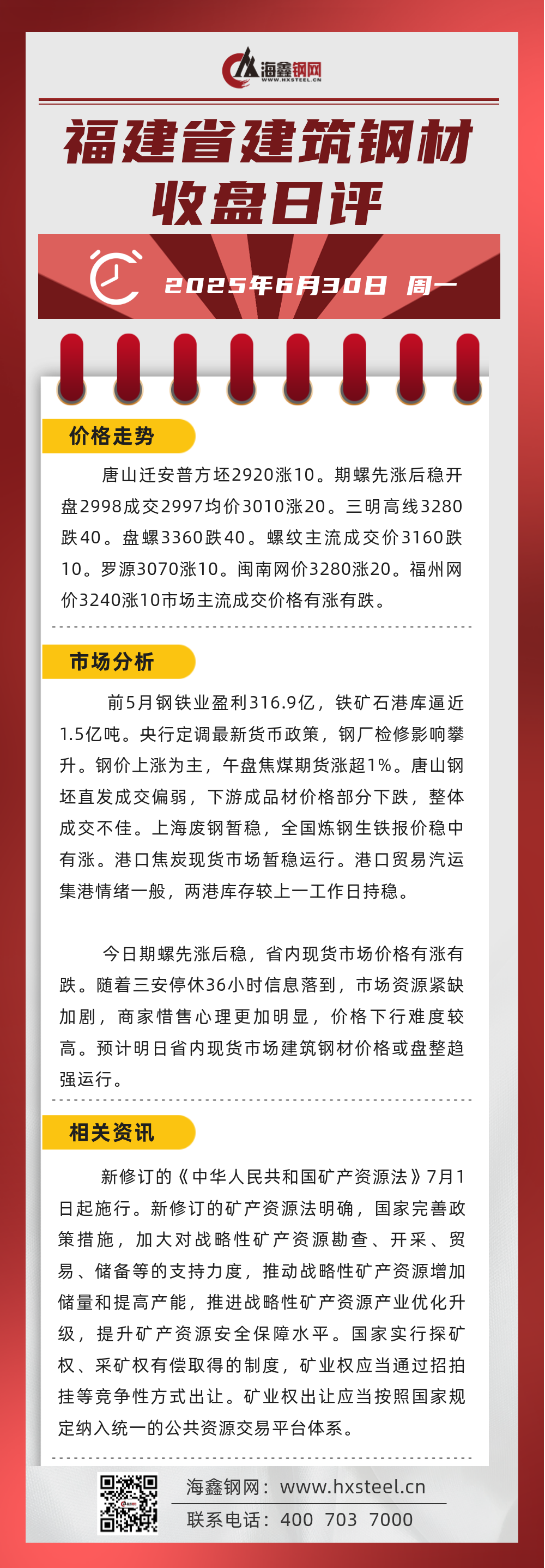 6月30日福建省內(nèi)建筑鋼材收盤日評(píng)