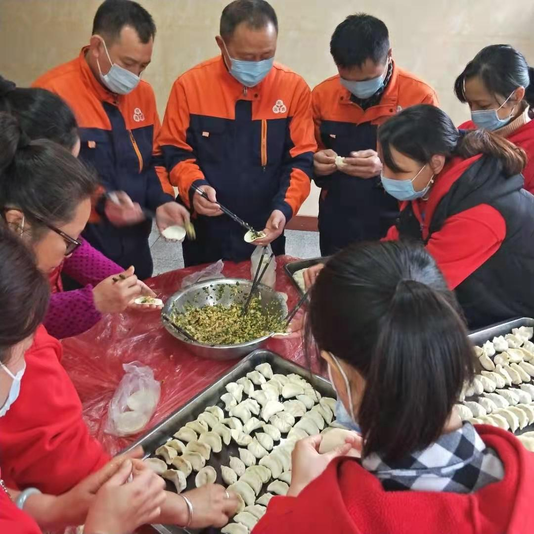 上午公司食堂工作人員就備好了餃子皮、肉餡、白菜、雞蛋、韭菜、硬幣等活動(dòng)所需材料,下午大家?guī)霞覍冽R聚食堂,挽起袖子,分工有序,各顯身手。有的調(diào)餡,有的打蛋,有的切菜,忙的不亦樂(lè)乎,很快就塑造出各類(lèi)帶有家鄉(xiāng)風(fēng)格的餃子,餃子的形狀也是創(chuàng)意百出,元寶形、耳朵形、月牙形、麥穗形等等,各式各樣。大家圍聚在一起,分享包餃子經(jīng)驗(yàn),講述自己家里的過(guò)年習(xí)俗及新年愿望,笑語(yǔ)不斷,氣氛和諧,歡聲笑語(yǔ)充滿著整個(gè)食堂操作間,手里捏出的每一個(gè)餃子都包含著職工間濃濃的關(guān)愛(ài)和對(duì)新年滿滿的祝福。